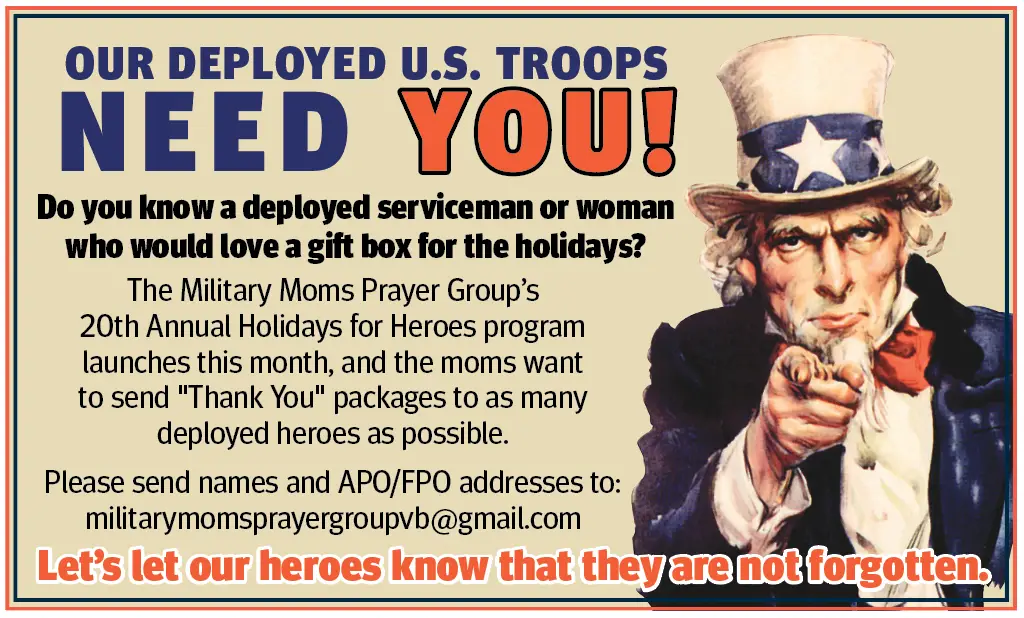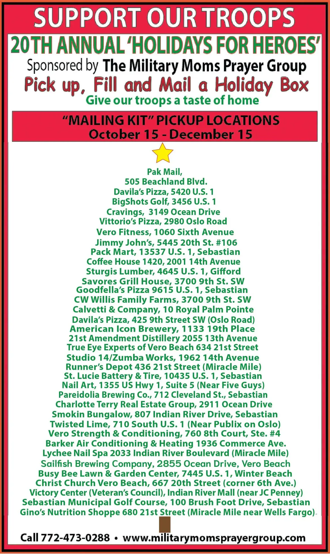 Each Mailing Kit contains a flat-rate USPS box; an instruction sheet for packing and shipping; a list of items requested by the troops; and a sample customs declaration form. All venues are in Vero Beach unless otherwise indicated. Our Holidays for Heroes recipients Thank You.